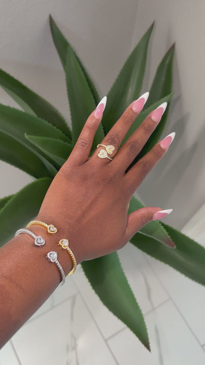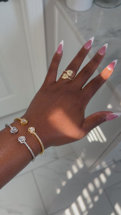 The Eternal Heart Bangle features a 9mm CZ heart on a 2mm premium brass bangle plated in 18k gold or white gold. Tarnish-resistant, hypoallergenic, and designed for effortless layering or solo elegance — a subtle yet feminine statement piece.